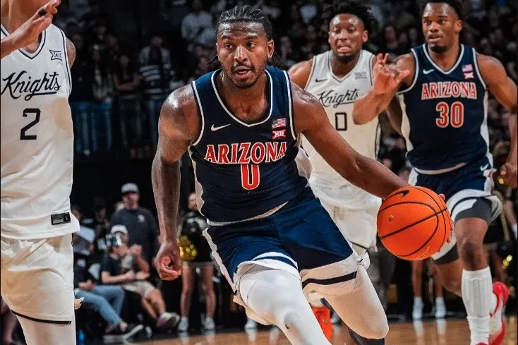 David Kelly Jan 17, 2026 Arizona point guard Jaden Bradley (0) scored 21 of his 23 points in the 2nd half of an 84-77 win over UCF. (Photo courtesy: Arizona Athletics)